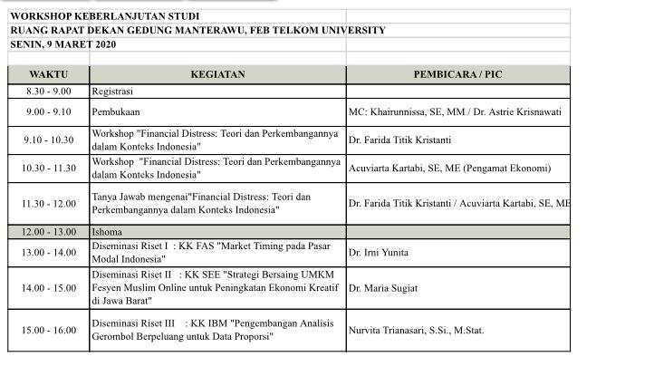 9 Maret 2020 Diadakan Workshop Financial Distress, dilanjutkan dengan dengan Diseminasi penelitian lintas KK Fakultas Ekonomi Bisnis, dimana masing – masing pembicara berasal dari KK SEE Dr. Maria Sugiat, KK IBM oleh Nurvita Trianasari, S. Si., M. Si, dan KK FAS oleh Dr. Irni Yunita